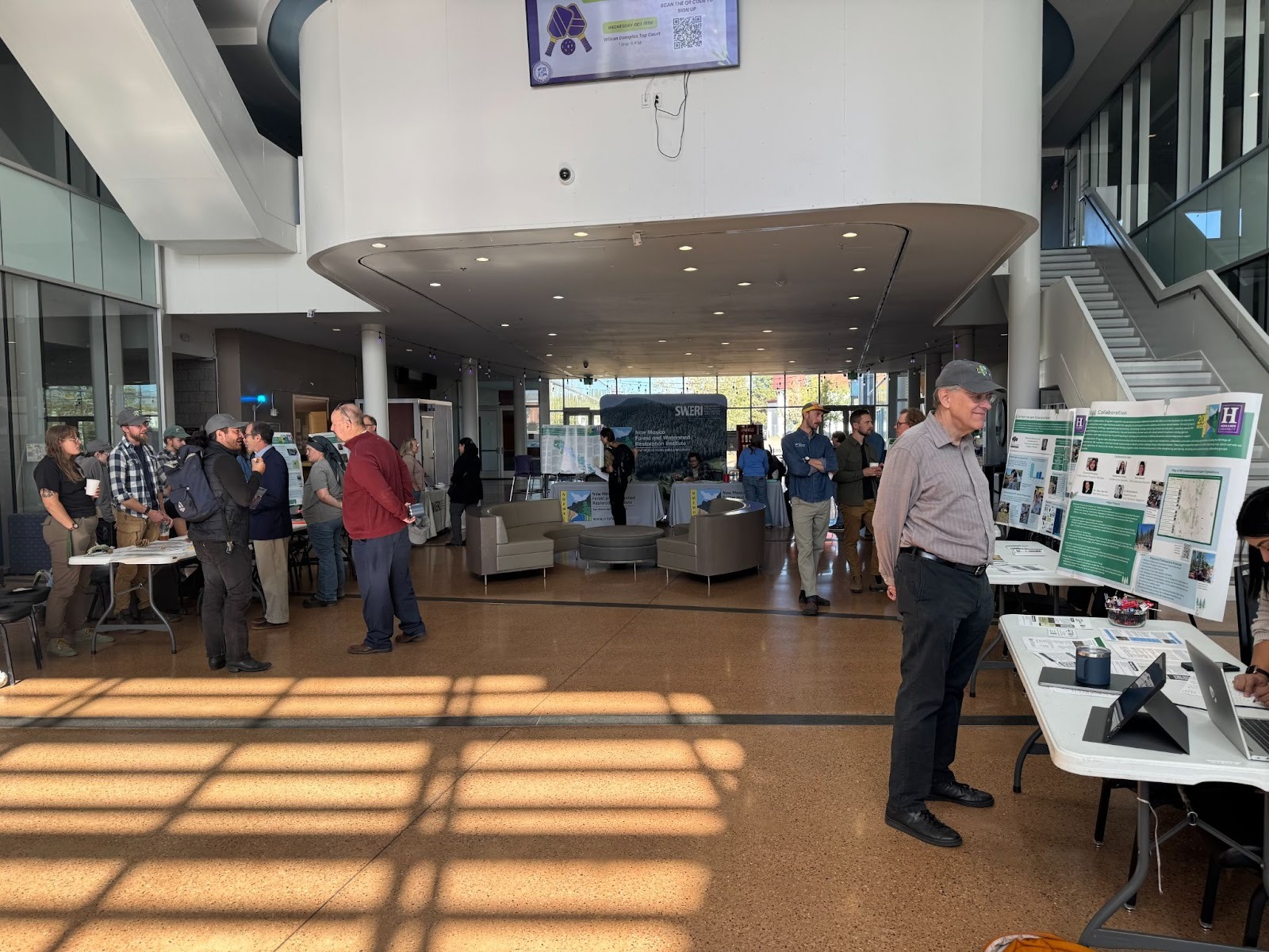 Focusing on the NMFWRI, the institute—as they describe it in their materials—has a mission “of supporting healthy forests to reduce catastrophic wildfires and restore resilient, fire- and climate-adapted ecosystems in New Mexico.” The institute works with communities around the state to reduce the risk of catastrophic forest fires and to promote healthy forests and watersheds. To accomplish this, the NMFWRI collaborates with state partners to monitor ecological conditions and changes in forests, provides resources and tools for state decision-makers, leads workforce training for forest restoration and landscape management, and offers workshops for landowners to restore their lands after fires. Here’s Director Alan Barton (on the right) hosting last week’s open house for the 20th anniversary of the NMFWRI:
