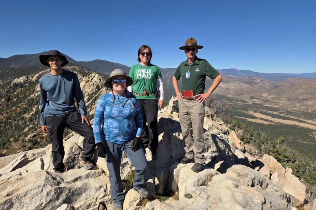 Dr. Jennifer Lindline, Chair of the Natural Resources Management Department, led a field trip to Philmont Scout Ranch with colleague Marine Foucher (Visiting Professor of Environmental Geology and GIS), student Isaiah Archuleta (Environmental Geology B.S. senior), and PSR volunteer Jerry Kendall. The goal of the trip—a 5.5-mile hike with more than 2,000 feet of elevation gain—was to collect a sample from the pinnacle of the Tooth of Time for geologic dating, a multi-month laboratory effort.
