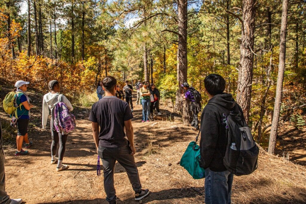 The Forestry and English learning community, taught by Dr. Michael Remke and Dr. Brandon Schneider, took a day-long field trip to the NMSU John T. Harrington Forestry Research Center and Collins Lake Ranch to explore the narratives and stories that connect humans to forested ecosystems, as well as the challenges and opportunities associated with fire in these environments. Students learned about fire ecology and post-fire reforestation, engaged with numerous forestry professionals, and gained valuable perspectives from guest professors Dr. Owen Burney, Dr. Andrei Toca, and Tammy Parsons, along with NMHU’s own Dr. Blanca Céspedes, Dr. Julie Tsatsaros, and Dr. Eric Romero.