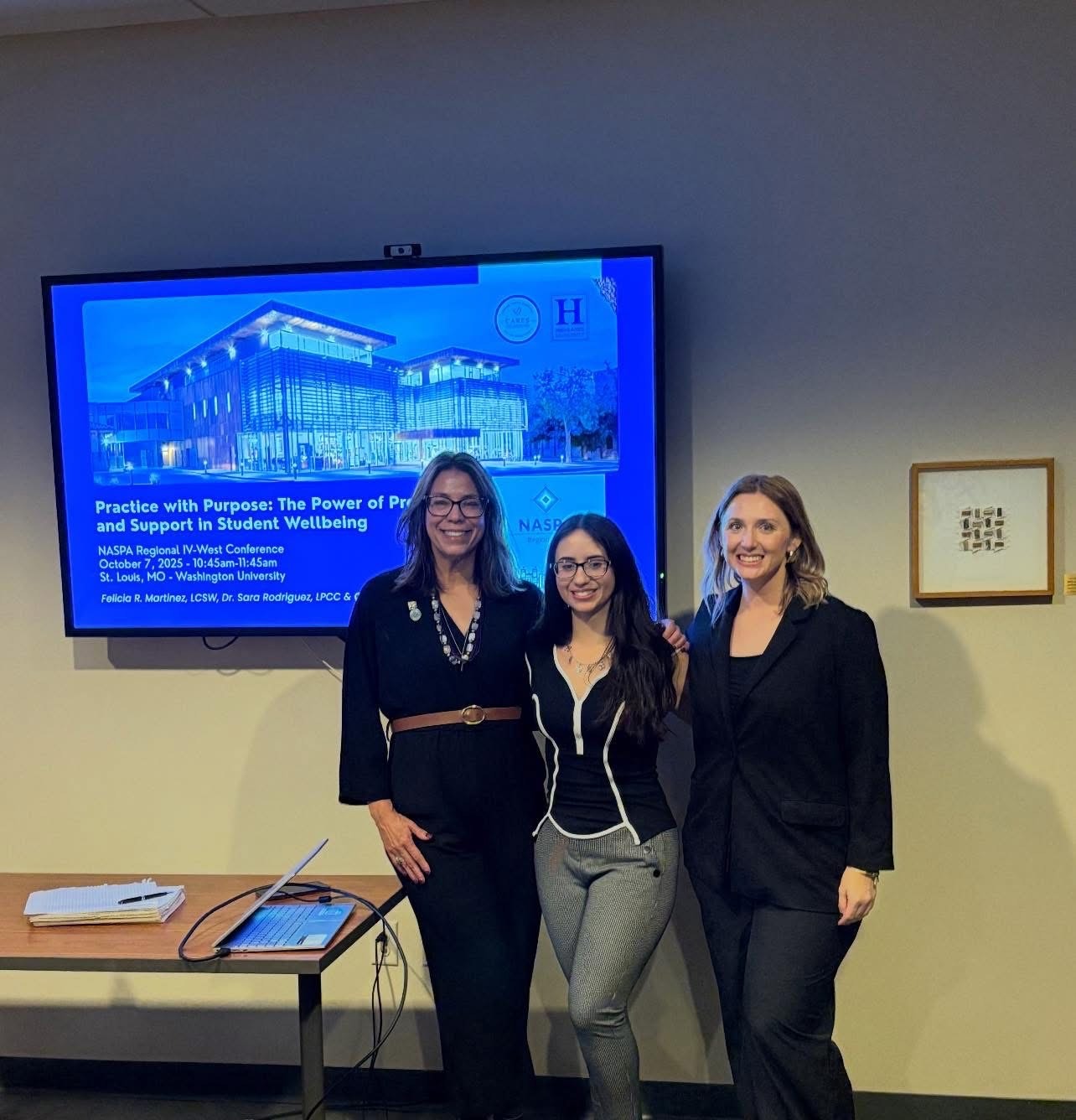Felicia Martinez, Dr. Sara Rodriguez, and Carmelita Sanchez from CARES were selected to present at the National Association of Student Affairs Administrators (NASPA) Regional Conference at Washington University in St. Louis. Their presentation, “Practice with Purpose: The Power of Presence and Support in Student Wellbeing,” highlighted the outstanding work NMHU is doing to support student mental health.