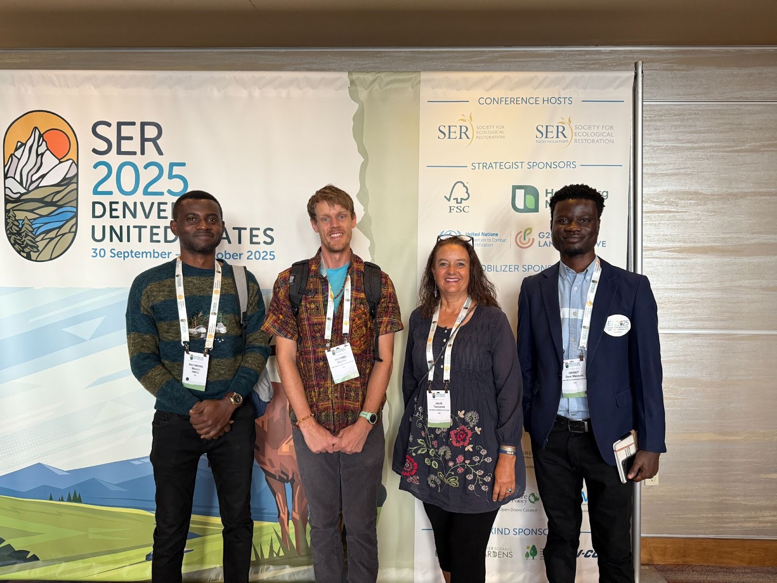 NMHU Forestry faculty members Dr. Michael Remke and Dr. Julie Tsatsaros took graduate students Richmond Mbami and Grant Osei-Mensah, along with undergraduate student Tomas Gonzales, to the Society for Ecological Restoration World Conference in Denver, Colorado, earlier this October. The conference provided an incredible opportunity for our team—especially our international students—to connect with restoration scientists and practitioners from around the world.